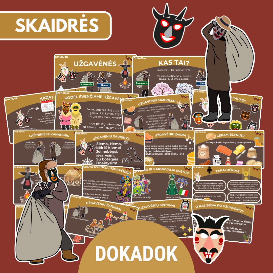 Kviečiame vaikus smagiai pasiruošti vienai linksmiausių metų švenčių – Užgavėnėms! Edukacinių skaidrių rinkinyje vaikai sužinos, kas yra Užgavėnės, kodėl jos švenčiamos, susipažins su svarbiausiomis tradicijomis ir personažais bei pamatys, kaip ši šventė minima kitose pasaulio šalyse.